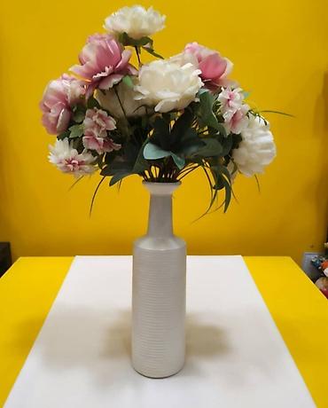 - Белая цилиндрическая ваза с узким горлышком и горизонтальным рельефом. Идеальна для букетов; на фото — композиция из пионов для наглядности масштаба.