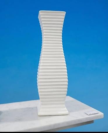 - Белая ваза с квадратным основанием и волнистым ребристым корпусом. Геометричный акцент, устойчиво стоит на полке или столе.