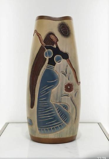 - Ваза с художественной гравировкой: матовая керамика с изображением девушки и цветка, теплые природные тона, мягко изогнутый силуэт.