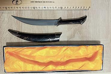 Декоративный кинжал с изогнутым лезвием и рукоятью, выполненной в темных тонах с металлическими акцентами. Рукоять и ножны украшены рельефным узором, имитирующим старинную гравировку. Ножны плотно прилегают к лезвию, обеспечивая безопасное хранение. Изделие поставляется в подарочной упаковке с внутренней отделкой из ярко-желтой ткани. Этот кинжал станет отличным дополнением к коллекции или оригинальным элементом декора.