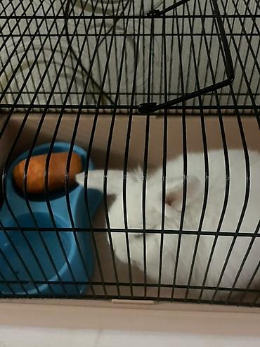 Белый декоративный кролик (ушастик с мягкой длинной шерсткой). Компактный, пушистый, спокойный в руках — любит сидеть, прижавшись к человеку. Окрас снежно-белый, уши светлые, глаза темные.
