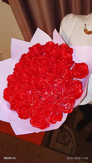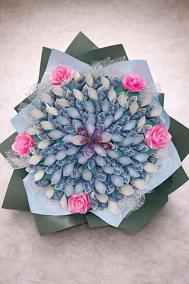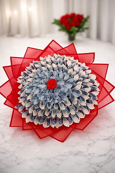 - Состав: аккуратно свернутые купюры, собранные в многослойные «лепестки» диаметром от среднего до крупного; центр украшен декоративными розами.