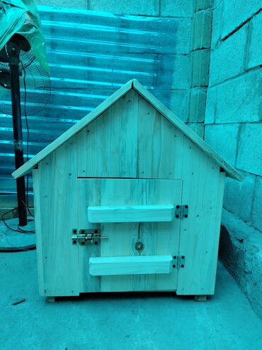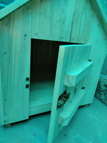 Подходит для размещения во дворе, на террасе или в вольере. Можно покрыть защитной пропиткой/краской под ваш вкус. Размеры по фото ориентировочно средние — комфортно для собаки небольших и средних пород.