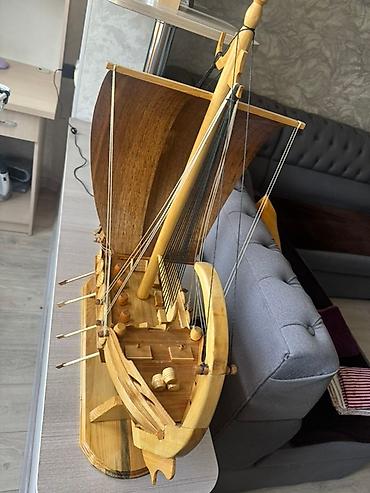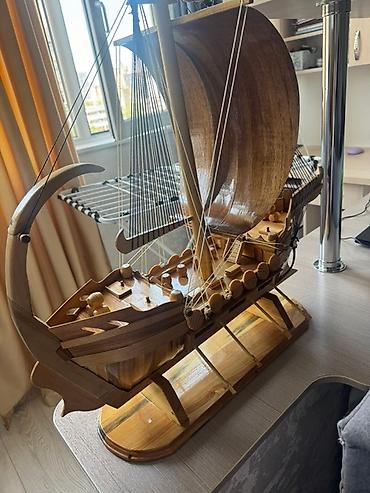 Деревянная декоративная модель старинного парусника, выполненная из светлого и темного дерева, с тщательно проработанными деталями, такими как паруса, мачты, весла и крепления. Модель установлена на устойчивой деревянной подставке, что делает ее идеальным элементом декора для дома или офиса. Этот изысканный сувенир станет прекрасным подарком для коллекционеров или любителей морской тематики.