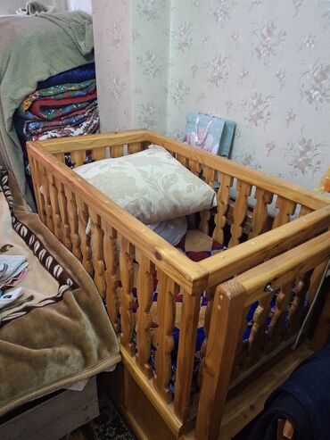 СРОЧНО СРОЧНО Деревянная детская кроватка с реечными бортиками. Изготовлена из натурального дерева светлого оттенка. Оснащена выдвижным ящиком в нижней части, который может быть полезен для хранения детских вещей или игрушек. Конструкция кроватки обеспечивает безопасность и комфорт для ребенка.