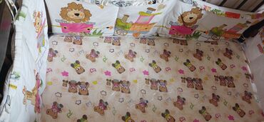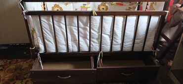 Деревянная детская кроватка с темной отделкой, оснащенная высокими бортиками для безопасности ребенка. Под спальным местом расположены два выдвижных ящика с удобными ручками, предоставляющие дополнительное пространство для хранения детских вещей, постельного белья или игрушек. Кроватка укомплектована матрасом и комплектом постельного белья с принтом в виде мультяшных персонажей. Модель подходит для обустройства комфортного и функционального спального места для малыша.Ребенок в ней не спал,стояла без дела.С матрасом и бортиками