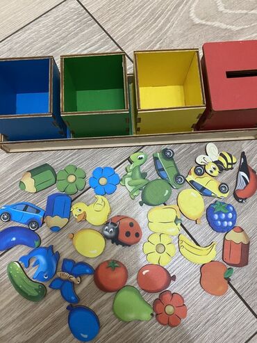 - Развитие мелкой моторики: бросаем фигурки через прорези, открываем/закрываем коробочки.