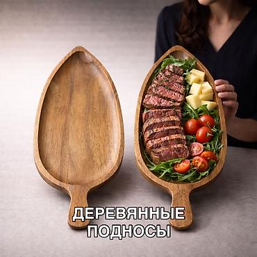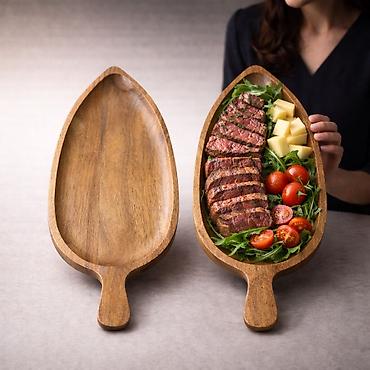 Стильное и универсальное блюдо из натурального дерева для красивой подачи блюд дома, в кафе или ресторане. Форма листа смотрится необычно и сразу привлекает внимание на столе.