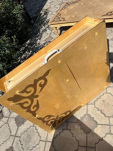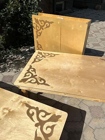 Низкие деревянные дастарханы/тақтаны для пола с узорной инкрустацией. - Материал: массив/фанера светлых пород, точёные ножки. - Формат: прямоугольные, складные по центру (столешница из двух полови...
