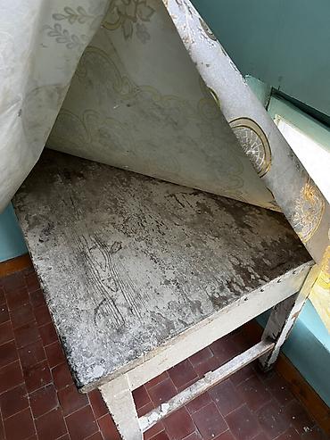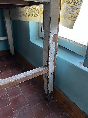 - Требует обновления покрытия/реставрации по вкусу: можно шлифовать, перекрасить, заменить/снять клеёнку.