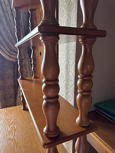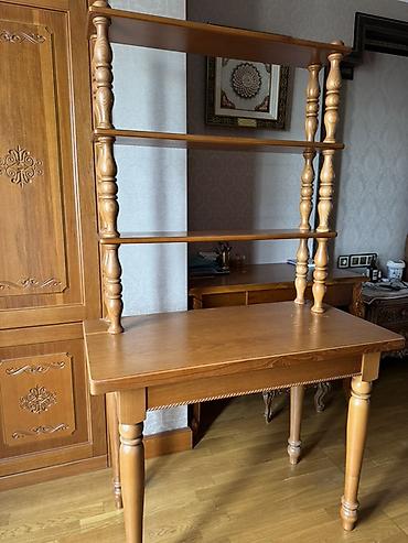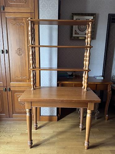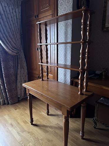 - Конструкция: классический стол на точёных ножках + вертикальная надстройка из трёх открытых полок.