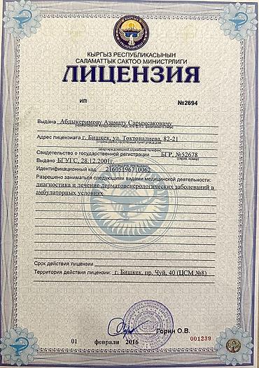 Дерматолог Абдыкеримов А. С. стаж 34 Консультация и леч. кожных бол.: аллергия, экземы, троф. язвы, гриб. бол., удаление морщин и рубцов, псориаз и т.д. Прием только по предварительной записи. Запись на прием с 7:00 до 9:30 на текущий день по тел. Возможен выезд на дом. мкр. Восток 5, пр. Чуй 40, ЦСМ 4, каб. 92 Пн,Вт,Ср,Чт,Пт,Сб,Вс - с 10:00 до 18:00 по записи.