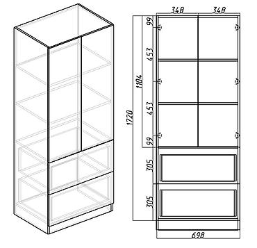 - Полный чертёж изделия с видами/размерами (пример – шкаф с двумя выдвижными ящиками и секцией полок: высота 1720 мм, ширина 698 мм; разбивка по осям, расстояния между полками, посадочные под фурнитуру).