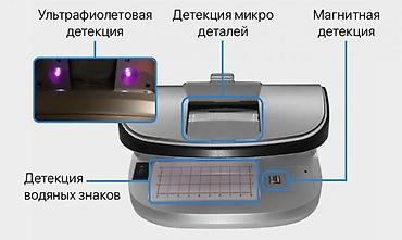 В устройстве также имеется встроенное увеличительное стекло для проверки микропечати и шкала для измерения размеров банкноты. Наличие донной подсветки позволяет проверить спектр краски, как дополнительная детекция для выявления поддельных купюр. Все 4 метода определения подлинности купюр можно применять одновременно или по отдельности.