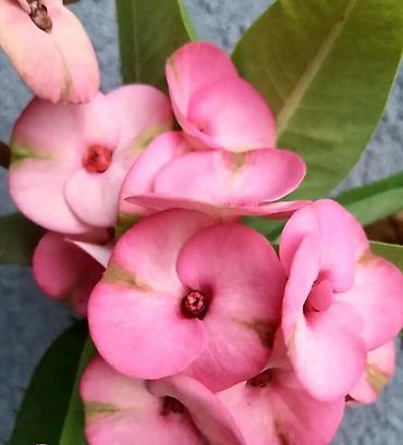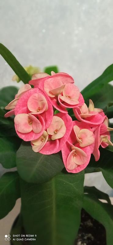 Молочай Миля (Euphorbia milii) в горшках - Крупные, сформированные кусты с плотной зелёной листвой и множеством соцветий нежно‑розового цвета. - Несколько укоренённых деток в отдельных маленьких г...