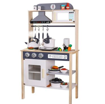 Представляем детскую игровую кухню из дерева, выполненную в натуральных тонах с серыми и белыми акцентами. Этот набор включает в себя разнообразные аксессуары, имитирующие настоящую кухонную утварь и бытовую технику, такие как микроволновая печь, плита, вытяжка, раковина с краном и духовой шкаф. Кухня оснащена крючками для подвешивания кухонных приборов, полками для хранения и звуковыми эффектами, имитирующими кипение воды, что делает игровой процесс более реалистичным. Прочная конструкция и реалистичный дизайн способствуют развитию воображения и социальных навыков у детей. Идеально подходит для сюжетно-ролевых игр, развивая мелкую моторику и творческое мышление.