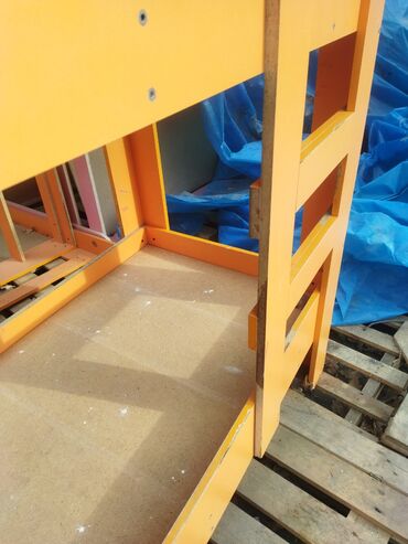 Комплектация по фото: каркасные элементы обоих ярусов, боковины с лестницами, основания под матрасы. Размеры ориентировочно под стандартные детские матрасы (уточняйте по фактическим габаритам деталей).