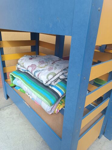 Детская кровать и игровая мебель для детей (для садика). - Двухъярусная кровать: каркас из ЛДСП, основной цвет синий с жёлтыми вставками. Две спальные зоны: нижняя и верхняя. По бокам — вертикальн...
