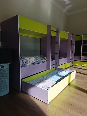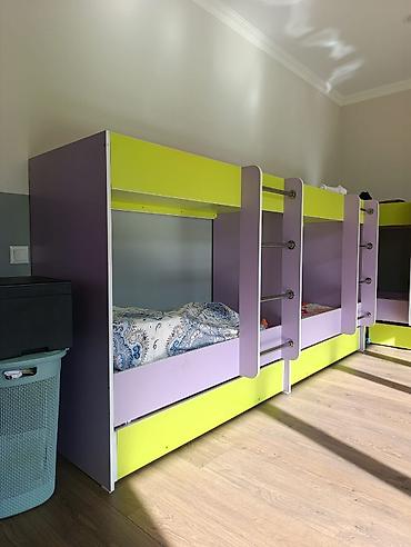 Детская двухъярусная кровать с выкатным дополнительным спальным местом/ящиком для хранения.