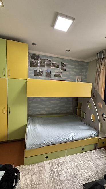 - Конструкция компактно использует угол комнаты: кровать примыкает к шкафу, верхний ярус расположён поперечно.