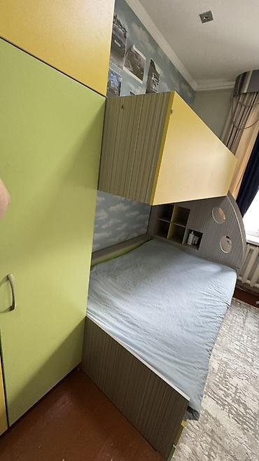 - Комплект включает: двухъярусную кровать, высокий модульный шкаф-купе/распашной с четырьмя дверцами, встроенные открытые полки у изголовья, нижние выдвижные ящики для хранения.