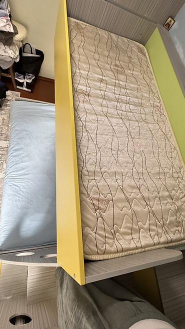 - Спальное место внизу — широкое (приблизительно двуспальное). Верхний ярус — стандартная односпальная кровать с защитным бортом. На фото показан матрас верхнего яруса.
