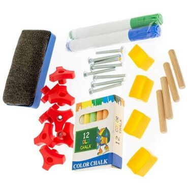- Конструкция: двусторонняя панель — с одной стороны белая магнитная для маркеров, с другой — зеленая меловая