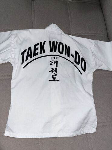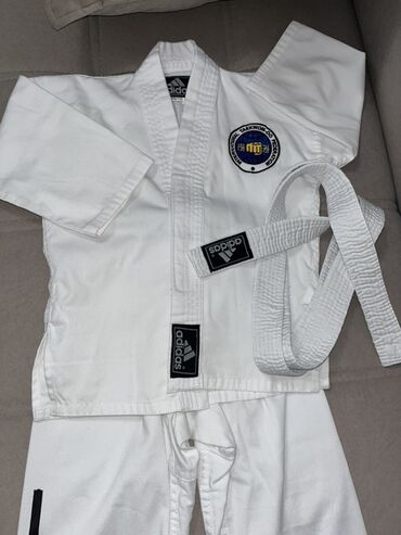 Белое кимоно Adidas для занятий тхэквондо. На куртке присутствует эмблема Международной федерации тхэквондо (ITF). В комплект входит белый пояс. Покупали за 3000 . На рост 110