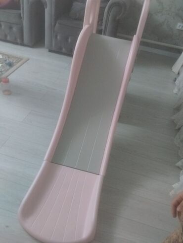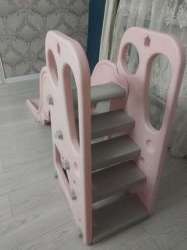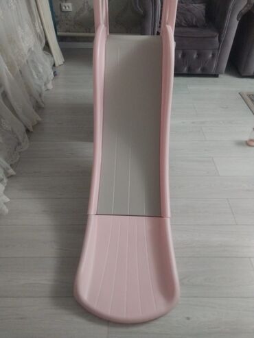 - Компактная пластиковая горка розового цвета с серой скользящей поверхностью