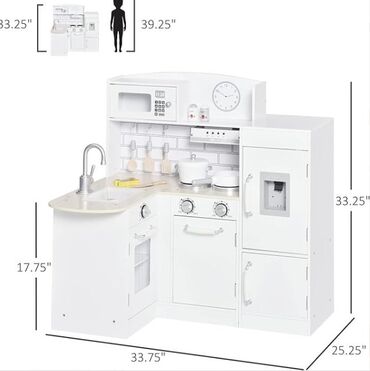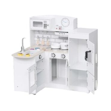 Белая детская игровая кухня с угловой планировкой, имитирующая