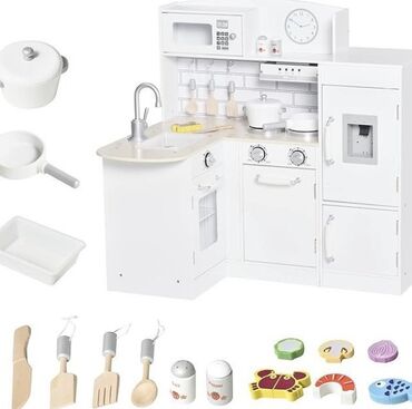 БелыйБелая детская игровая кухня с угловой планировкой, имитирующая реалистичную кухонную среду для ролевых игр. Включает в себя раковину с краном, плиту с двумя конфорками, микроволновую печь и холодильник с открывающимися дверцами. Над плитой расположены крючки для подвешивания кухонных принадлежностей, а также имитация вытяжки. В комплект также входят разнообразные игровые аксессуары, такие как кастрюля, сковорода, деревянные лопатки и ножи, а также игровые продукты. Эта кухня способствует развитию мелкой моторики, социальных навыков и творческого мышления у детей. Идеально подходит для детских комнат или игровых зон.