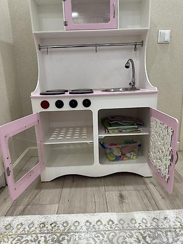 Детская игровая кухня из дерева (розовая) Описание: - Большая стойка-кухня с рабочей столешницей, духовкой, варочной панелью с 4 конфорками, раковиной с краном, открытыми полками и верхними шкафчи...