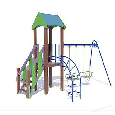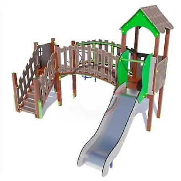 Детский игровой комплекс для улицы (возраст 3–7 лет) Описание: - Многофункциональный игровой модуль с двумя уровнями и навесным домиком. - Элементы: горка с бортами, лестница с перилами, переходно...