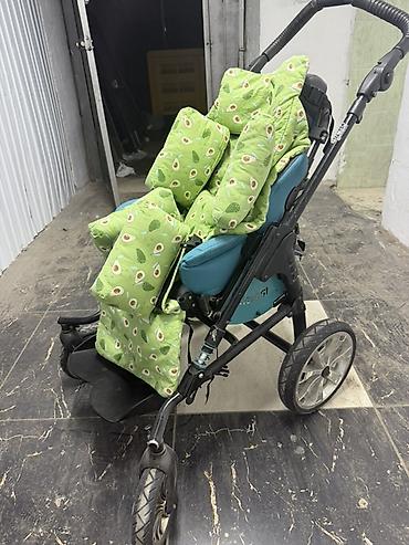 - Прогулочная коляска с усиленной рамой и большими задними колесами, передние — поворотные с возможностью фиксации.