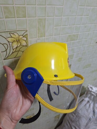На ребенка 3-6 лет. производство Германия. Детская каска пожарного ярко-желтого цвета Пожарного Сема, оснащенная прозрачным защитным забралом. Забрало закреплено по бокам синими элементами и имеет желтую окантовку по нижнему краю. В центре передней части каски расположен круглый значок с изображением шестеренки и буквы "S", что может указывать на принадлежность к определенному персонажу или серии игрушек. Каска дополнена ремешком для фиксации на голове, обеспечивающим удобство и безопасность во время активных игр. Идеально подходит для сюжетно-ролевых игр, развивая воображение и моторику.