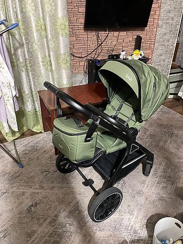 Детская коляска 2 в 1 (люлька + прогулочный блок), цвет оливковый на черной раме.