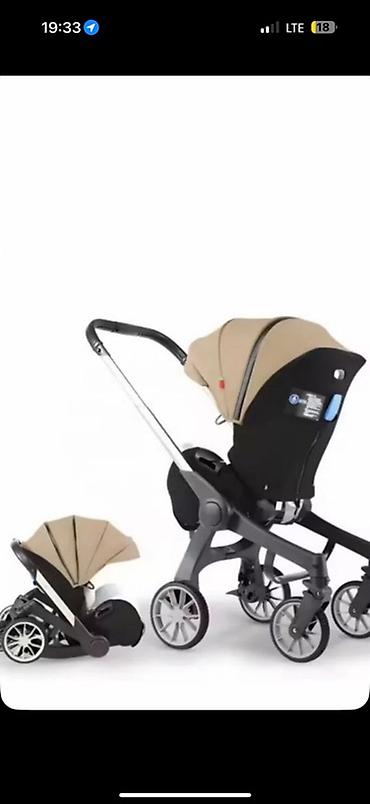 Детская коляска с модульной системой 2-в-1 (шасси + прогулочный блок/люлька в стиле “капсула”), бежевый капюшон, черное шасси.