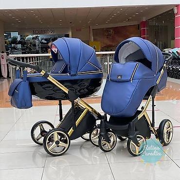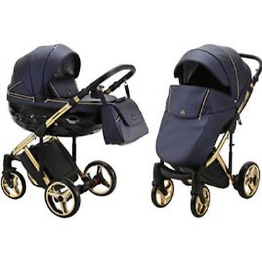Детская коляска-трансформер 2-в-1 (люлька/прогулочный блок), универсальная для города и прогулок. Особенности: - Шасси из металла с золотистым покрытием, амортизаторы на раме для мягкого хода. - П...