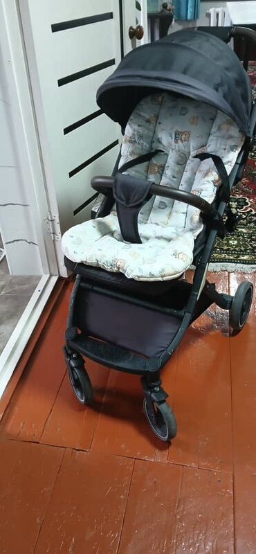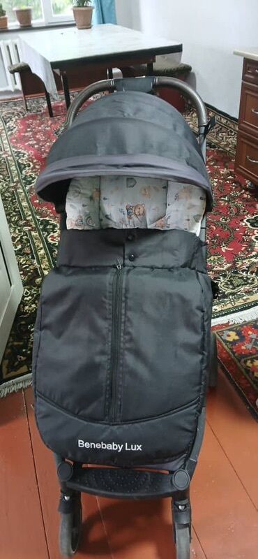 Универсальная детская коляска черного цвета, модель Benebaby Lux, предназначена для комфортных прогулок с малышом. Оснащена регулируемым капюшоном, который защищает от солнца и ветра, а также бампером для дополнительной безопасности. Передние колеса поворотные, обеспечивая легкость маневрирования, а задние фиксированные. В комплекте имеется утепленный чехол на ножки для прохладной погоды и мягкий матрасик с детским рисунком для дополнительного комфорта. Коляска имеет ремни безопасности для надежной фиксации ребенка и корзину для хранения под сиденьем. Идеально подходит для ежедневных прогулок.