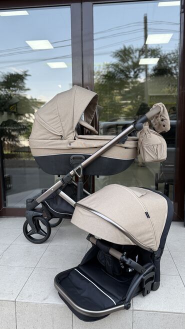 НовыйУниверсальная коляска в бежевых тонах с серебристой рамой. Люлька с регулируемым капюшоном и защитной накидкой подходит для прогулок в любую погоду. В комплекте сумка для мамы, которую удобно закрепить на ручке коляски. Коляска оснащена вместительной корзиной для покупок и вещей.
