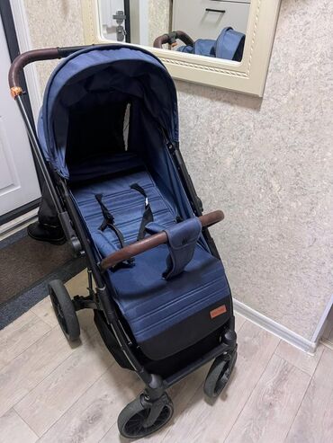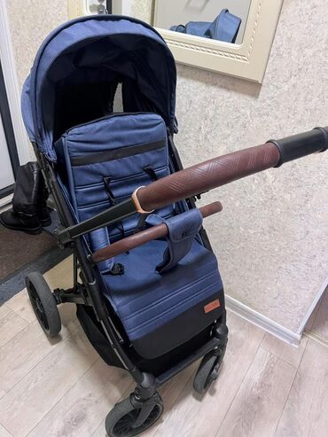 Прогулочная коляска inning baby, цвет темно‑синий с коричневыми экокожаными накладками на бампере и перекидной ручке.