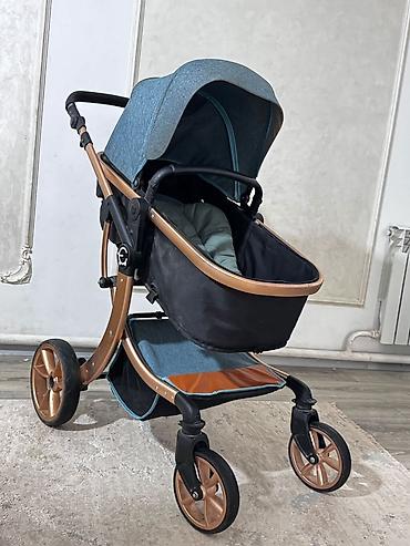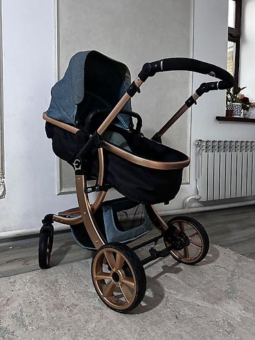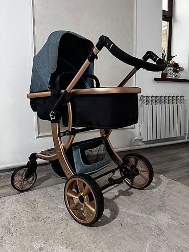 Цветовая гамма: сине-серый текстиль, черные элементы и рама золотистого оттенка. Отличный вариант на каждый день: маневренная, устойчивая, с удобной корзиной и возможностью быстрого перехода от люльки к прогулке.