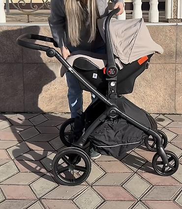 - Автокресло/люлька для новорождённого: установка на шасси одним кликом через адаптеры, защитный капюшон. Удобно для переноски и поездок.
