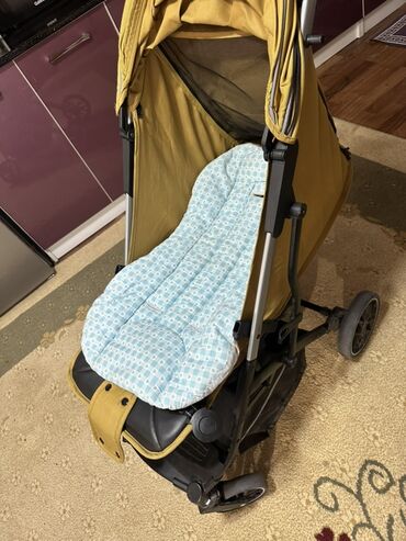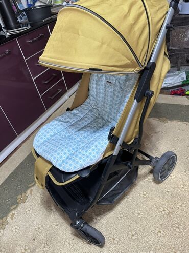 Цвет ткани: горчично‑желтый с черной окантовкой; рама серебристая, колеса серо‑черные. Отлично подходит для прогулок по городу и поездок.