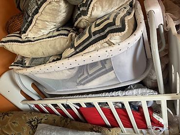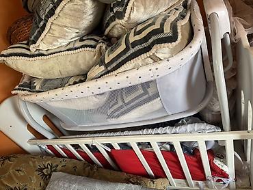 В комплекте на фото также видны элементы от детской кроватки с реечными боковинами (белый цвет) и текстиль: подушки/бортики и матрасик.