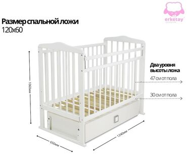 Представляем детскую кровать белого цвета, оснащенную маятниковым механизмом для укачивания и выдвижным ящиком для хранения вещей. Размер спального места составляет 120x60 см, что обеспечивает комфортное пространство для сна ребенка. Ложе имеет два уровня высоты от пола: 47 см и 30 см, позволяя регулировать его положение по мере роста малыша.