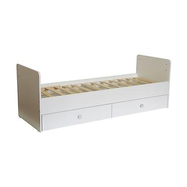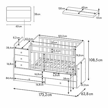 - Универсальная система: сначала используется как кроватка с защитными бортиками, затем превращается в подростковую односпальную кровать длиной 170 см.