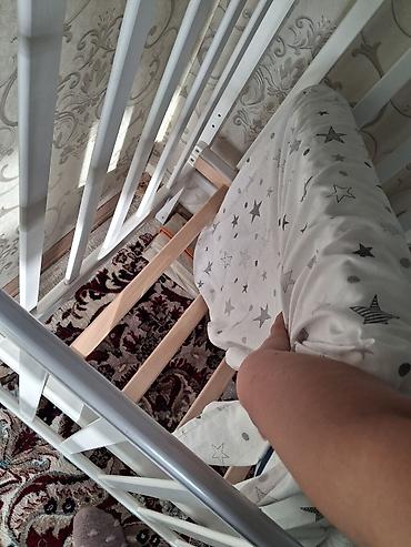 В комплекте на фото: матрас с наматрасником/простыней со звёздным принтом и тканевое покрывало (по снимкам). Размеры ориентировочные как у стандартной детской кроватки (для матраса ~120×60 см).