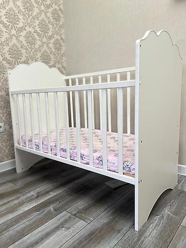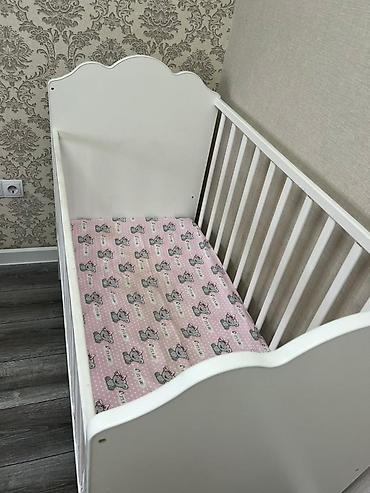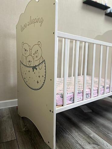 Детская кроватка-манеж, белая, с фигурными изголовьями и милым принтом с медвежатами на одном из торцов. Матрас бамбуковый в подарок.