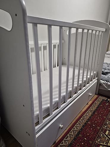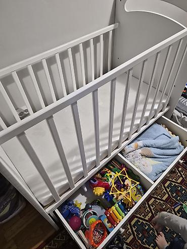 - Хранение: большой выдвижной ящик на всю длину кроватки, разделён на секции — удобно для игрушек, пелёнок и постельных принадлежностей.